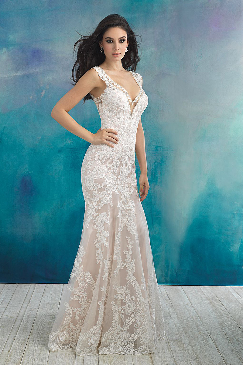 Illusion lining seems to suspend the lace appliques and sparkling beading along the neckline and scoop back of this gown.