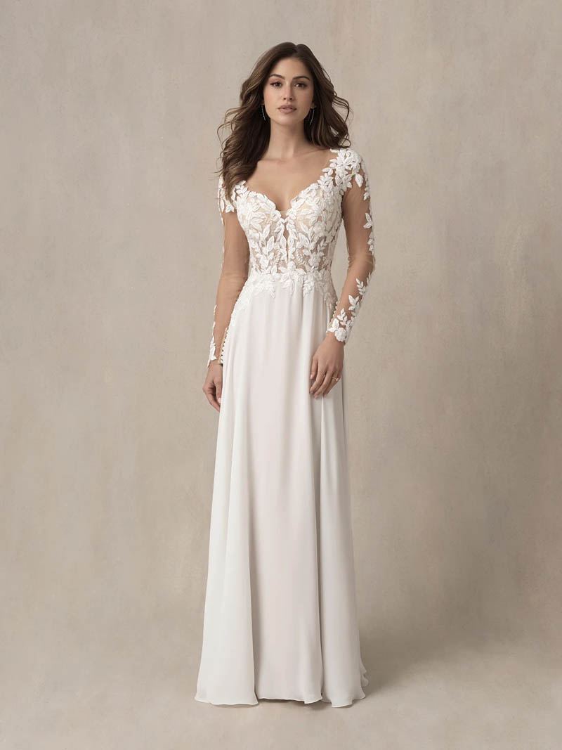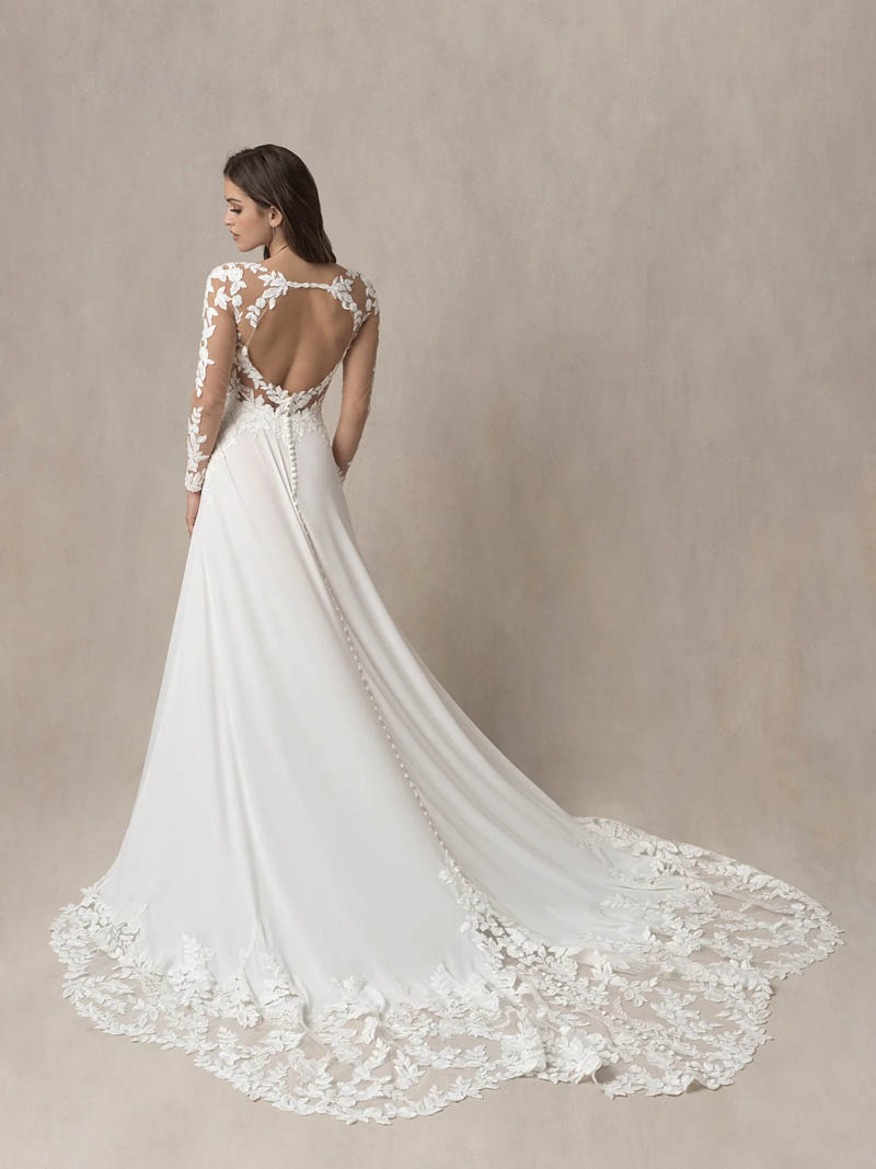 The illusion hemline of this gown echoes the open illusion back and sheer long sleeves on the bodice, showcasing countless blooms and leaves.