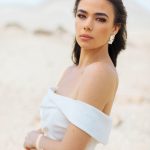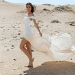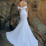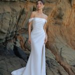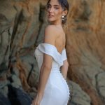 The F348 Peony gown is composed of dreamy draped crepe and accented by an off-shoulder strap. This gown is both playful and gentle. It will look as beautiful during your elegant walk down the aisle as it does when dancing to your favorite songs at the reception. Embody the richness and charm of this beautiful flower when you try the gown for yourself.