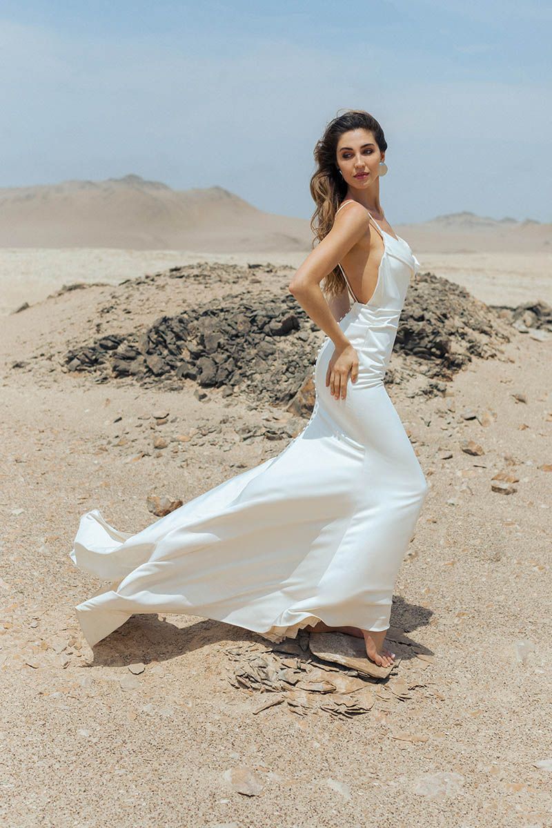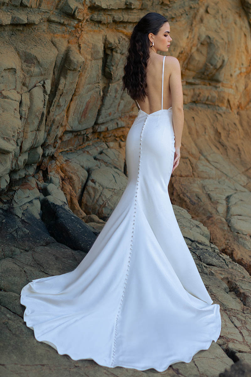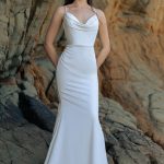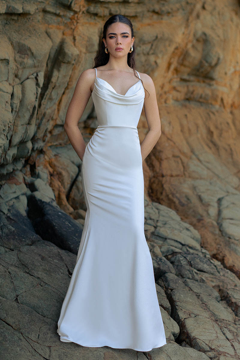 The F349 Rose gown is an elegant part of our nature-inspired Wilderly collection. Rose’s soft cowl bodice gives a peek at a sweetheart neckline and leads to a chic stretch satin sheath silhouette. Modern style meets timeless beauty in this stunning gown. Whether you’re planning an outdoor ceremony or a cozy indoor reception, the class and sophistication of this gown will turn heads.