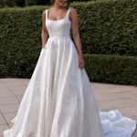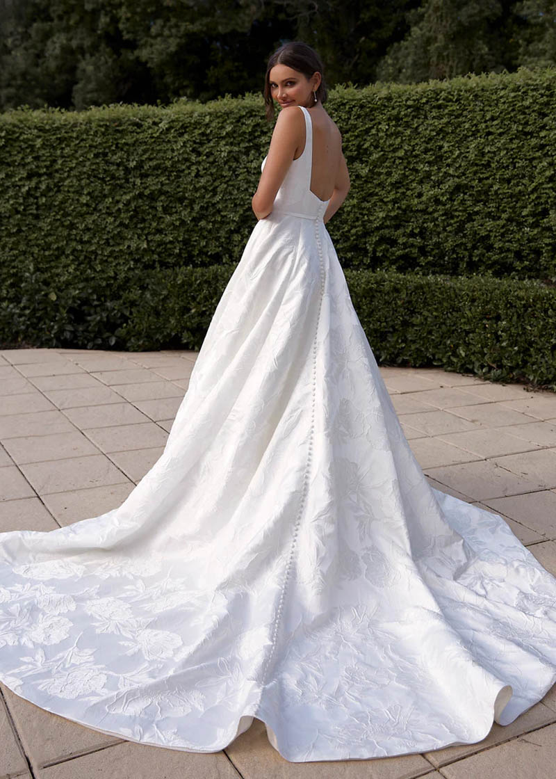 Meet Mahogany, your modern classic. Crafted from luxurious Jacquard Satin, available in Ivory & Vintage White, it’s the epitome of timeless elegance. The square neckline and wide-set straps provide both style and support. Adorned with floral Jacquard satin fabric, Mahogany exudes sophistication. With built-in bra cups, boning, and soft fusing, the bodice ensures a flawless fit. Complete with an invisible zip and full back button closure, this floor-length A-line silhouette is designed for effortless grace. Mahogany is your perfect blend of tradition and modernity.